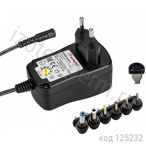 В комплекте поставки идут 6 сменных разъемов для подключения к различным устройствам 5,5 х 2,5 мм, 5,5 х 2,1 мм, 4 х 1,7 мм, 3,5 х 1,35 мм, 2,5 х 0,75 мм, 2,5 мм micro-jack и ключ для переключения выходного напряжения.