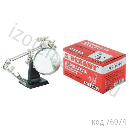 Инструмент состоит из чугунного основания (тяжелая подставка), шарнирного соединения с зажимами типа «крокодил» (подвижных во всех плоскостях) с никелевым покрытием и лупы с 3-х кратным увеличением (возможность регулировки положения, диаметр линзы 60мм)